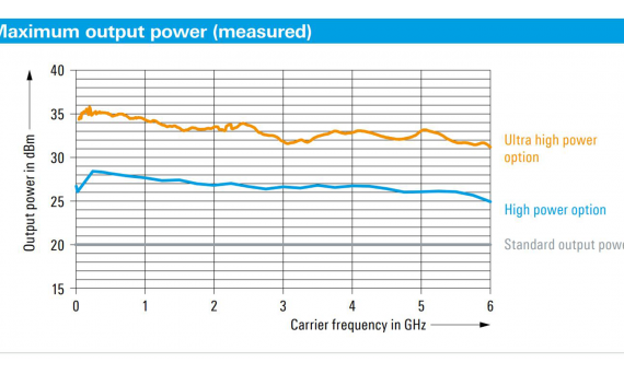 当配备适当的选件时,R&S SMBV100B可产生高达+34 dBm(在1 GHz下测量)的输出功率,并且在几乎整个频率范围内指定的电平增加到+25 dBm。
