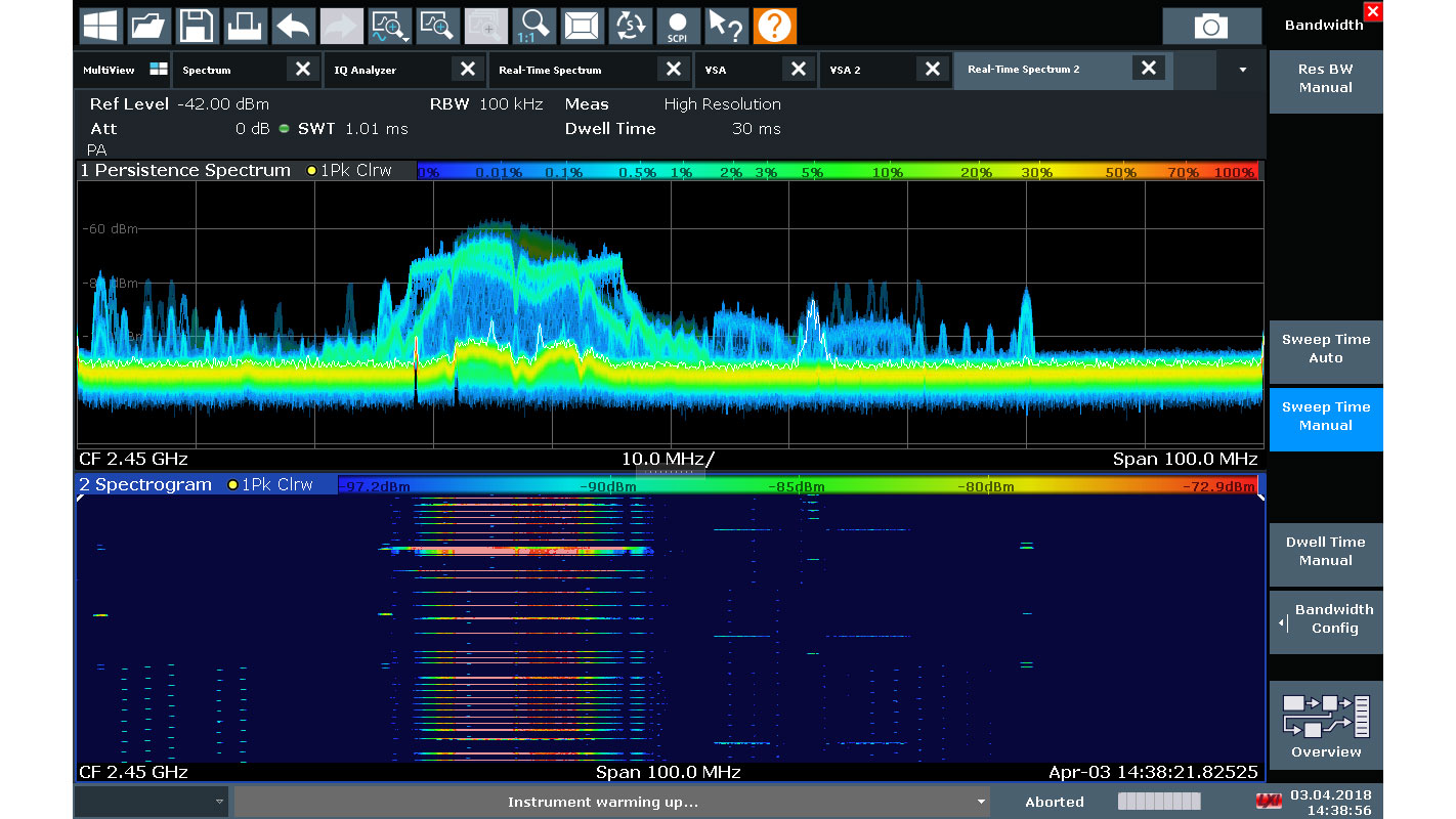 用户可以使用 R&S®FSW 实时选件在高达 800MHz 的带宽中可靠检测纳秒级极短偶发干扰信号,即使接近强力载波时也同样如此。实时频谱分析有助于用户分析现有跳频算法并创建替代算法,以防止相同频段内符合不同标准的信号之间发生冲突。